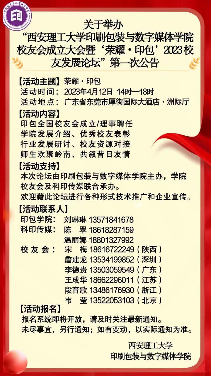 校友会成立大会暨“荣耀•印包”2023 校友发展论坛第一次公告