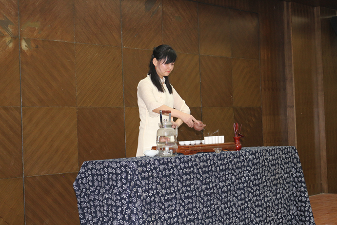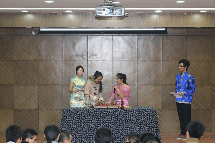 茶,是中华民族的举国之饮。发于神农,闻于鲁周公,兴于唐朝,盛于宋代。几千年来从喝茶到品茶,从识茶到悟茶,茶文化薪火相传生生不息。从林军先生的介绍中我们了解了许多茶文化知识,包括茶的起源、茶的生长习性以及茶的品种与分类。林军先生引经据典,分别通过红茶和乌龙茶的两则故事将茶文化与人生紧密相连,引导大家从茶文化中品味人生。随后两位茶艺师相继为大家进行了茶艺表演,并邀请同学现场体验,让大家在互动中亲身感受茶文化的博大精深。